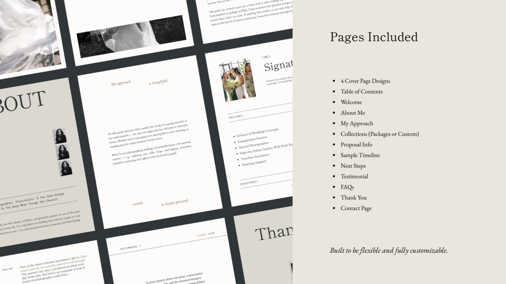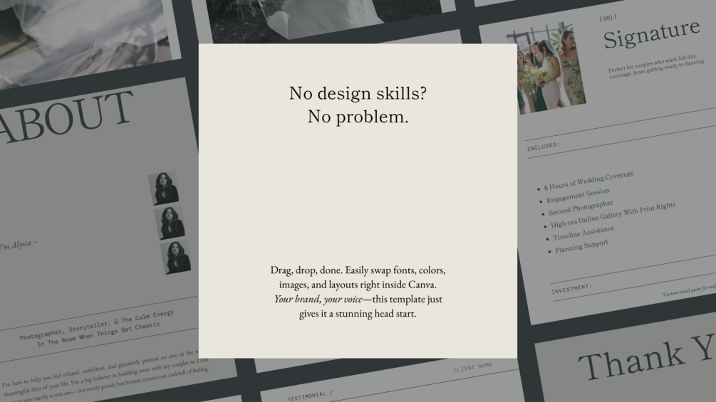 A fully customizable 42-page Canva template designed for wedding photographers who want their client experience to feel as artful as their work.